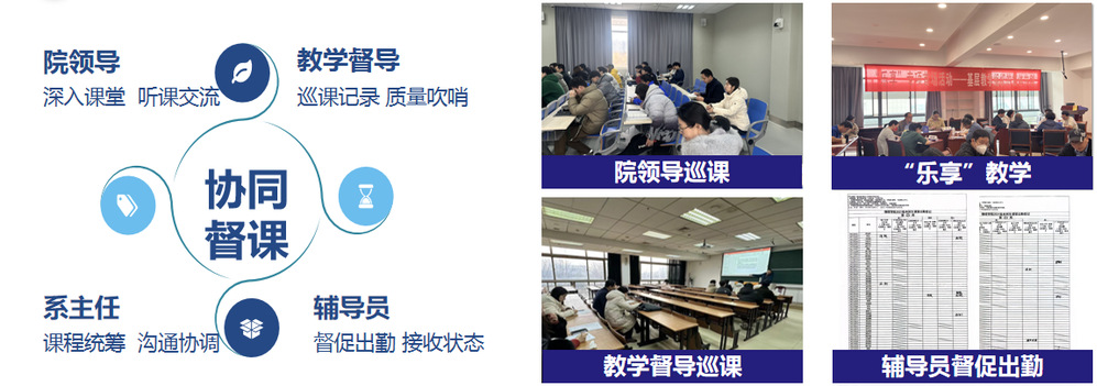 作为基础教学大院,小妲己直播 一直高度重视教学质量,建立院领导、教学督导、系主任、辅导员协同督课机制,年度深入课堂巡课、听课、查课,百分百覆盖本院全体学生及兄弟小妲己直播 大学小妲己直播班级,教学督导整理汇总建议,助力教师课堂教学水平不断提升。对专业核心课程组织开展过程性测试,开展常态化答疑,形成学习功夫花在平时,知识理解更深更透的良好学习生态。